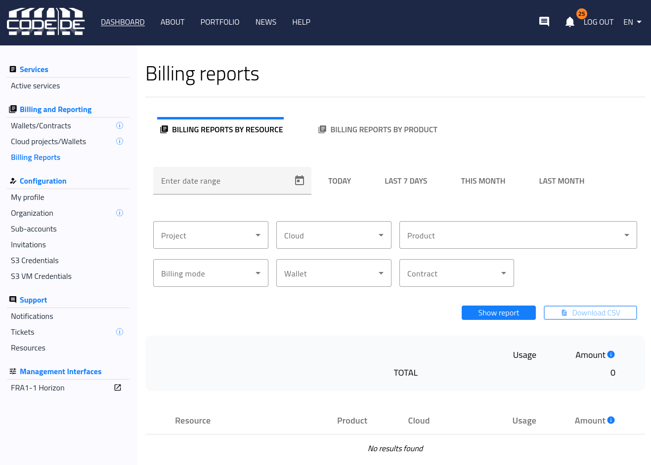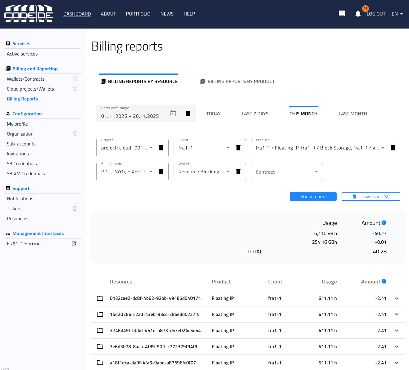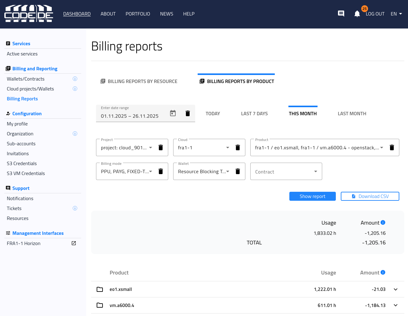 Monitoring cloud costs regularly helps you manage resource consumption and optimize spending. In the CODE-DE Dashboard, under Billing and Reporting → Billing Reports, you can view your usage and costs in two distinct ways: