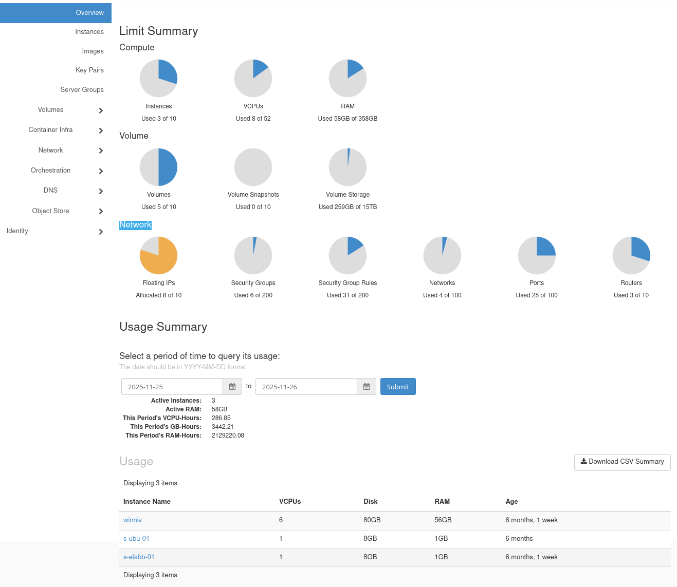 Before comparing billing reports, it helps to know which instances and flavors are active during the billing period. You can check this in Horizon → Compute → Overview → Usage Summary, as shown below.