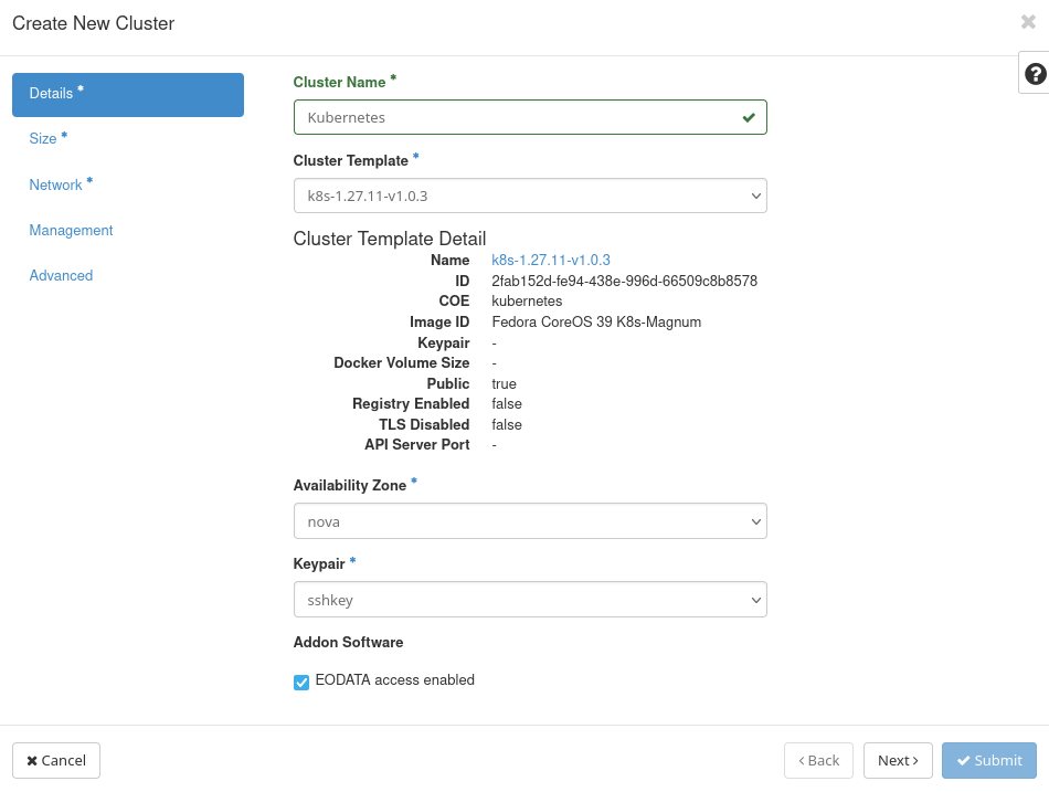 On the left side and in blue color are the main options – screens into which you will enter data for the cluster. The three with the asterisks, Details, Size, and Network are mandatory; you must visit them and either enter new values or confirm the offered default values within each screen. When all the values are entered, the Submit button in the lower right corner will become active.
